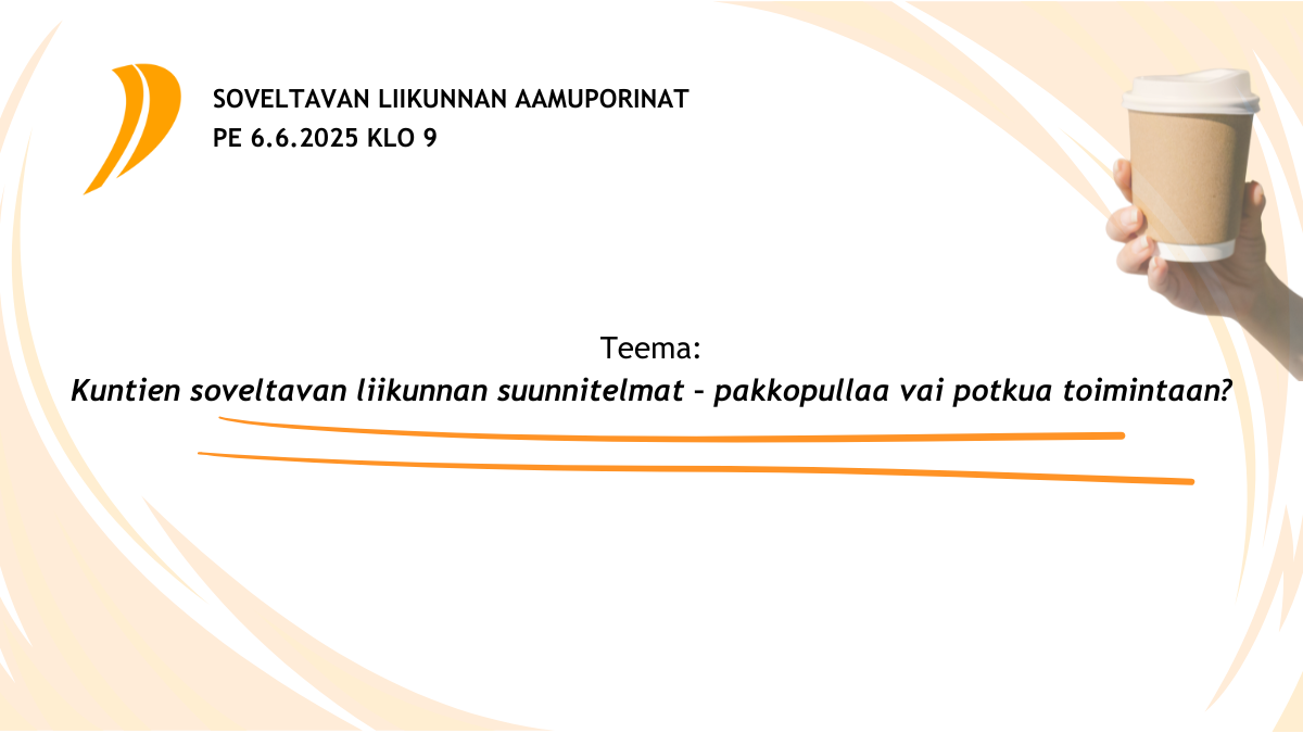 Vuoden 2025 toinen Soveltavan liikunnan aamuporinat -webinaari pidettiin perjantaina 6.6 klo 9–10.15. Aamuporinoiden aiheena oli "Kuntien soveltavan liikunnan suunnitelmat – pakkopullaa vai potkua toimintaan?".